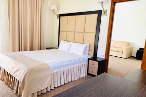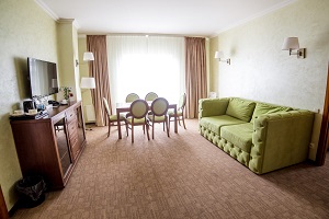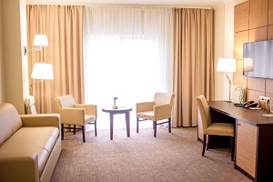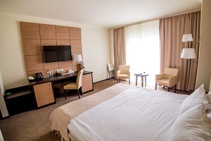 Podwójne łóżko, rozkładana sofa, telewizor, minibar, klimatyzacja, sejf, telefon.