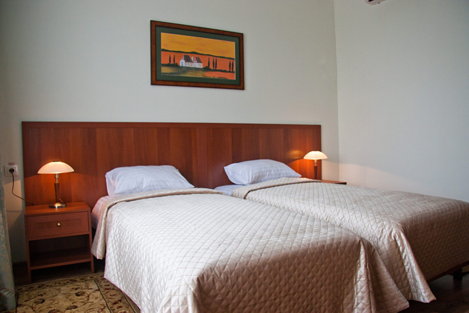 2 односпальні ліжка або 1 двоспальне ліжко, телевізор, холодильник, телефон, фен.