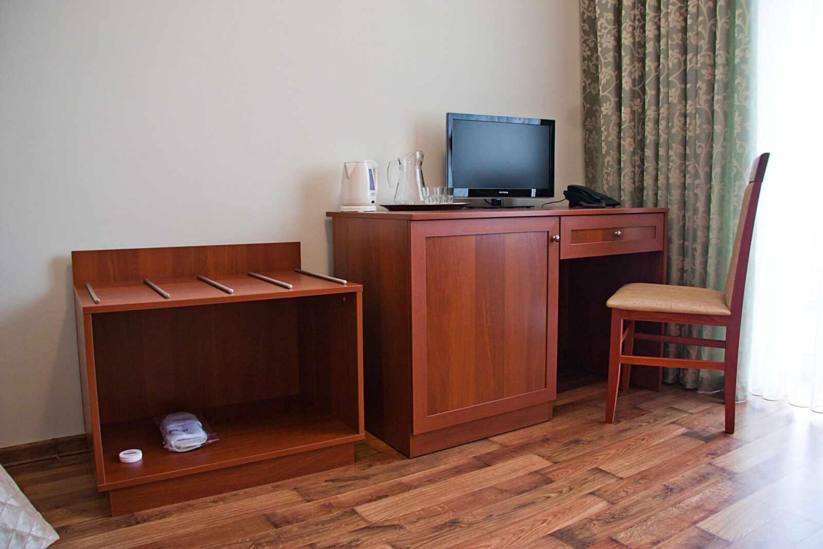 Односпальне ліжко, телевізор, холодильник, телефон, фен.